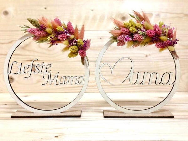 Noteer tijdens het afrekenen bij de opmerkingen welke naam of tekst we in de hoepel moeten voorzien en de kleurcombinaties van de droogbloemen . Ieder ontwerp is een beetje anders , afhankelijk van de voorraad aan droogbloemen op het moment van de bestelling.