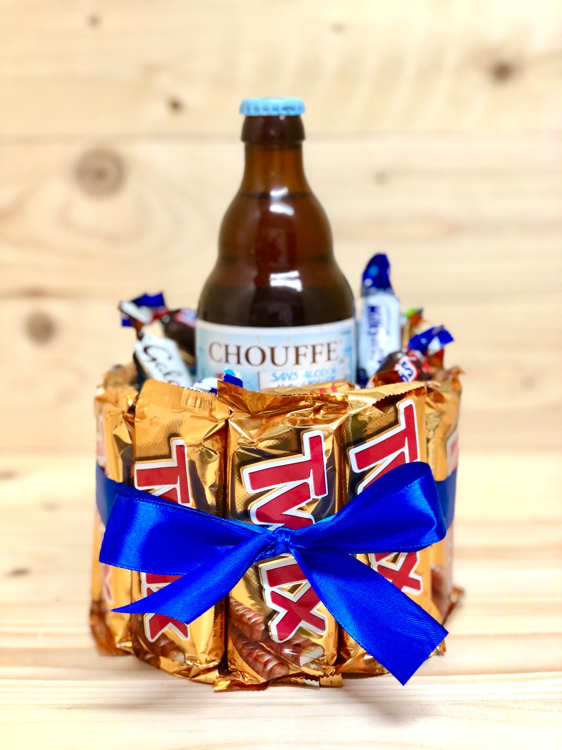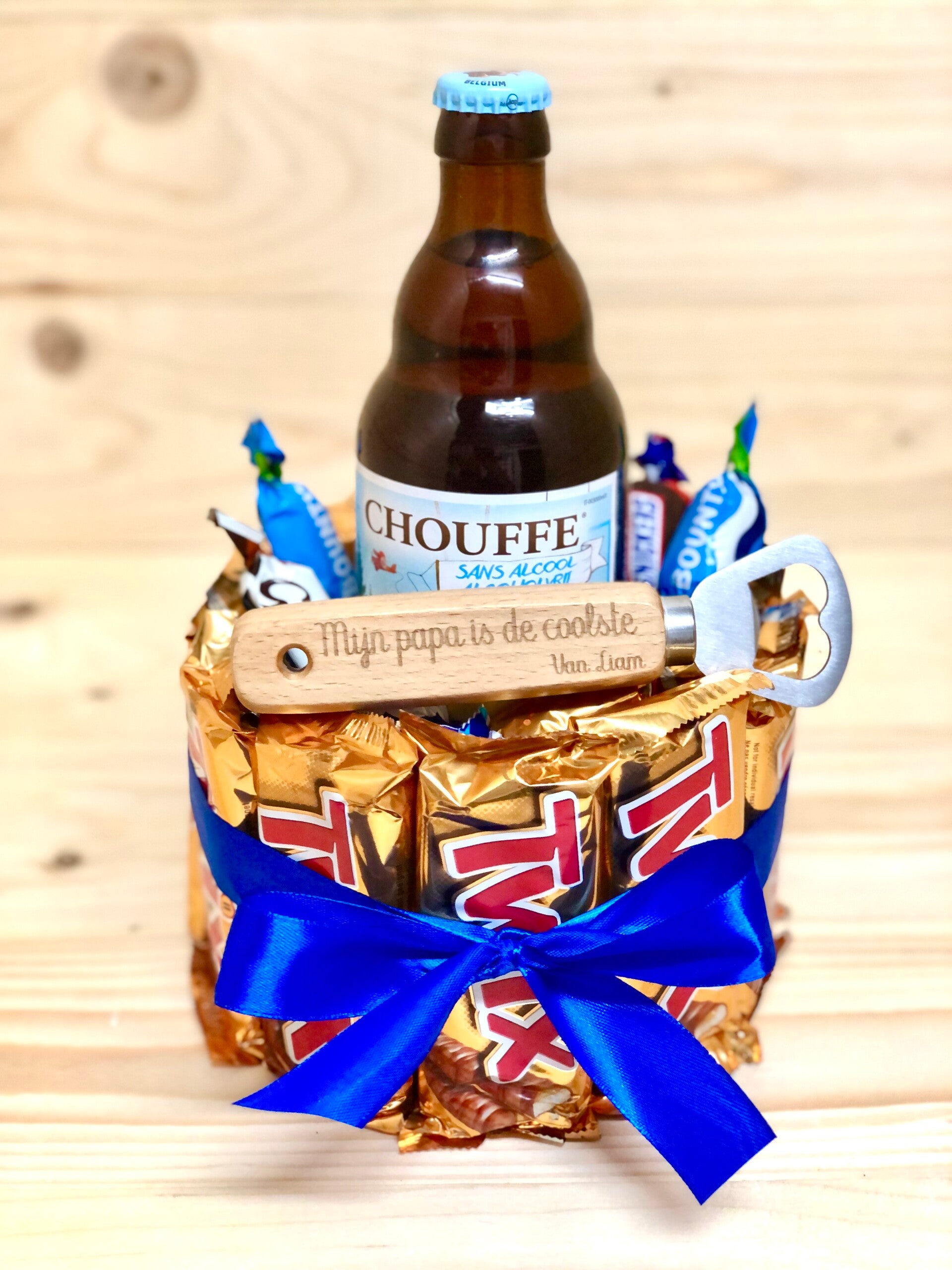Verschillende soorten snoep gecombineerd met een lekker flesje bier . Kies zelf het favoriete biertje van jou papa, opa of plus papa en wij verwerken het in de taart . ( je kan het soort biertje doorgeven in het vakje opmerkingen bij jou bestelling ). Je kan ook onze gepersonaliseerde flesopener met jou naam/tekst toevoegen aan de taart !
