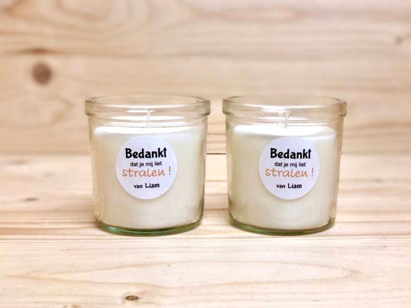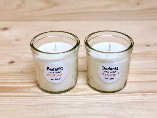 Deze leuke geur kaarsen kan je personaliseren met de naam van jou Juf/Meester en die van jou kindje en Tadaaaaa je hebt een uniek en persoonlijk afscheidscadeau ! Leuk in de klas en past in ieder interieur .