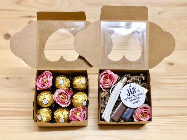 Een schattig hartjes doosje gevuld met lekkere Ferrero pralines en afgewerkt met zijden roosjes voor de lieve Juf.