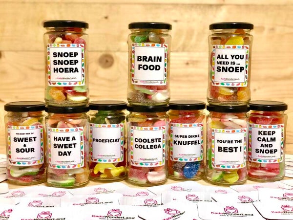 Wil Je Graag Iemand Verrassen Met Een Lekker Cadeautje ? Kies Dan 1 Van Onze Leuke Snoeppotten  Gevuld met de Beste Zoete of Zure Snoepjes. Heb Je Een Speciale Gelegenheid, Contacteer Ons Zodat We Een Snoeppot Maken Met Een Aangepaste Tekst Of Tekening !