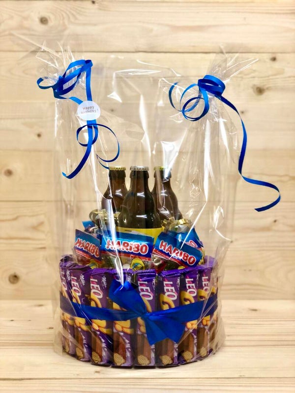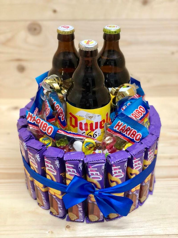 Verschillende soorten snoep gecombineerd met een lekker flesje bier . Kies zelf het favoriete biertje van jou papa, opa of plus papa en wij verwerken het in de taart . ( je kan het soort biertje doorgeven in het vakje opmerkingen bij jou bestelling ). Je kan ook onze gepersonaliseerde flesopener met jou naam/tekst toevoegen aan de taart !