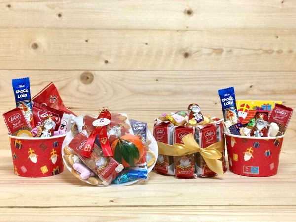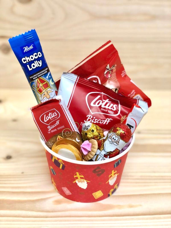 Binnenkort komt hij alweer aan : Sinterklaas ! Op zoek naar een lekker cadeautje of traktatie voor 6 december ? Deze beker vol lekkernijen is het ideale cadeautje . Aarzel zeker niet om ons te contacteren , zodat wij een Sint Beker op maat kunnen maken , aangepast aan het budget .