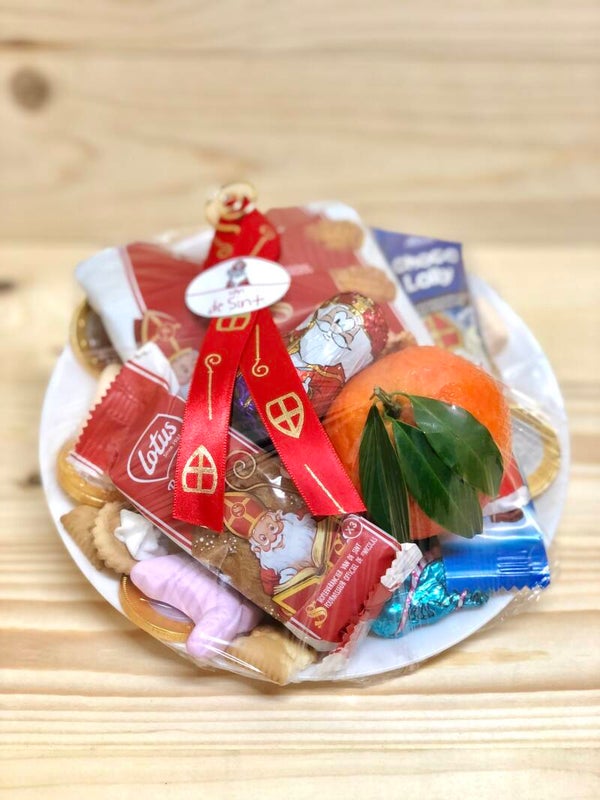 Binnenkort komt hij alweer aan : Sinterklaas ! Op zoek naar een lekker cadeautje of traktatie voor 6 december ? Dit traditioneel bordje vol lekkernijen is het ideale cadeautje . Aarzel zeker niet om ons te contacteren , zodat wij een Sint bordje op maat kunnen maken , aangepast aan het budget .