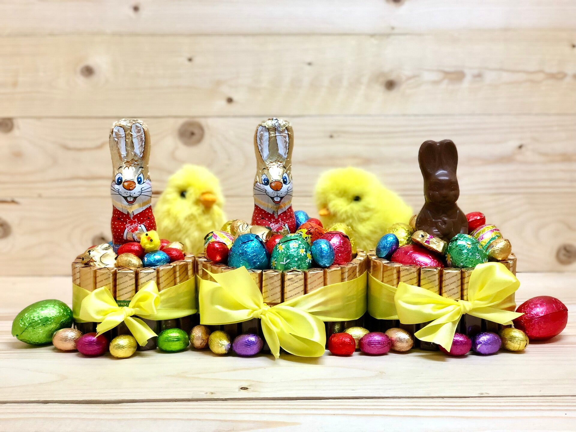 In ons Assortiment hebben we diverse leuke cadeautjes met verschillende soorten chocolade en paaseieren . Kies uit een mix van verschillende chocolade of enkel Kinderchocolade .